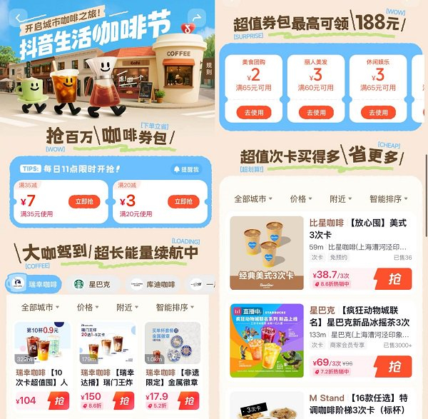 “抖音生活咖啡节”以百万咖啡券作为核心福利,每日11:00抢限量咖啡券,不限时段全天发放超值券,至高可获得188元品类券,还可在团购优惠价的基础上额外满减。整合线上优惠,协同多家咖啡商家打造多元创新玩法,助力商家实现声量饱和和生意的显著增长。