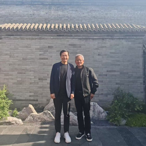 照片中,在北京高达35度的气温下,黄仁勋依旧身穿标志性的皮衣,两人面带微笑,表现亲密,身后是一处古色建筑。在另一张照片中,二人站在一辆小米汽车旁,对着镜头比出大拇指。
