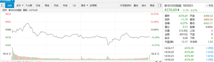走势上看,新华500指数(989001)16日低开,指数盘初短暂上行,随后震荡回落。指数盘中最高触及4400.24点,最低触及4363.17点,成分股全天总成交额报4053亿元。