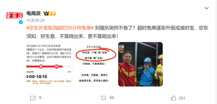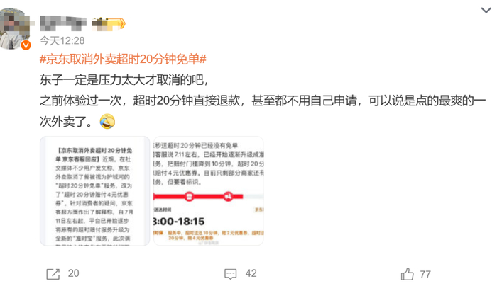 客服人员还表示,当前商家自送订单仍可能享受超时免单,超时后平台会自动触发。而京东骑手配送订单均已投保“准时宝”,超时后按保险规则赔付优惠券,不再直接免单。