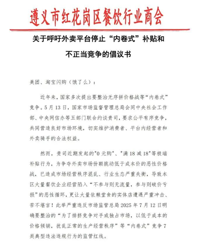 7月15日,贵州省遵义市红花岗区餐饮行业商会发布《呼吁外卖平台停止“内卷式”补贴和不正当竞争倡议书》。