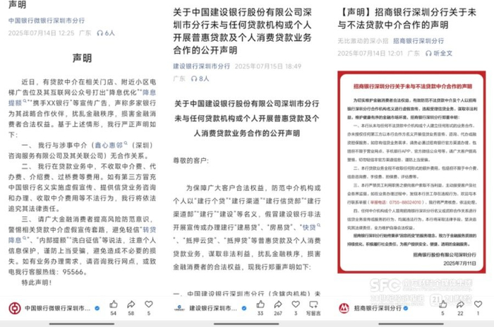7月15日,南方财经记者注意到,深圳超15家银行密集发布声明,称某贷款中介机构假冒合作方揽客。