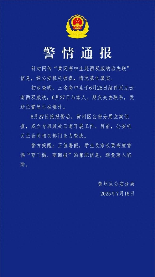 针对网传“黄冈高中生赴西双版纳后失联”信息,经公安机关核查,情况基本属实。初步查明,3名高中生于6月25日结伴抵达云南西双版纳,6月27日与家人、朋友失去联系,发送位置显示在境外。