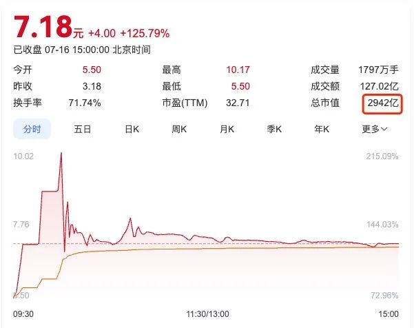 截至收盘,华电新能股价为7.18元/股,大涨125.79%,总市值当天最终定格为2942亿元。