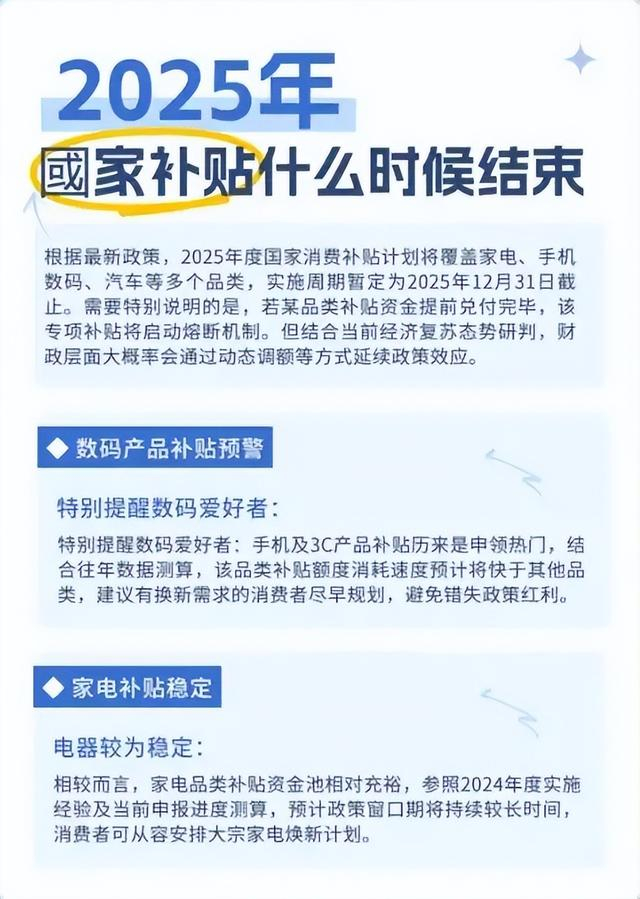 虽然上半年不少人因额度耗尽未能领到补贴,但要明确,国补政策全国统一截止时间未变,仍为 2025 年 12 月 31 日。