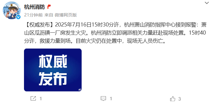 2025年7月16日15时30分许,杭州萧山消防指挥中心接到报警:萧山区瓜沥镇一厂房发生火灾。杭州消防立即调派相关力量赶赴现场处置。15时40分许,救援力量到场。目前火灾仍在处置中,现场无人员伤亡。