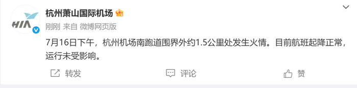 7月16日下午,杭州机场南跑道围界外约1.5公里处发生火情。目前航班起降正常,运行未受影响。