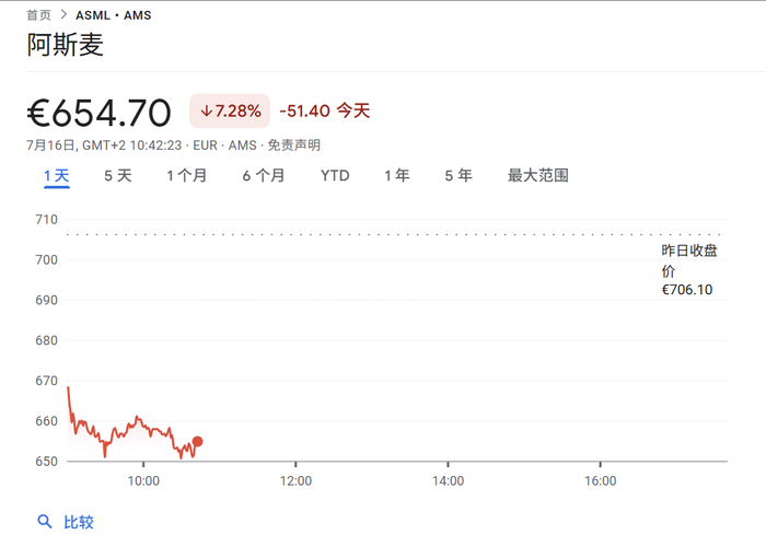 受此影响,阿斯麦股价下跌超过7%,至654.70欧元/股,创下自4月以来最大单日跌幅。过去一年,其股价累计下跌33%。