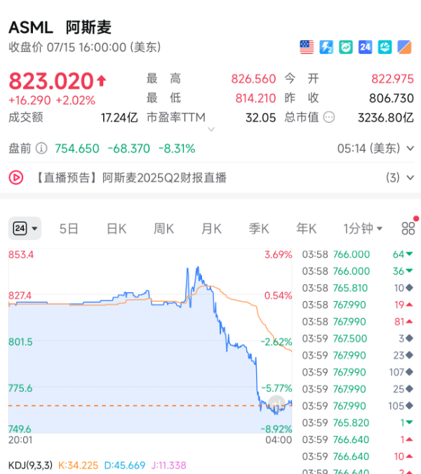 美股盘前,阿斯麦股价暴跌超8%。