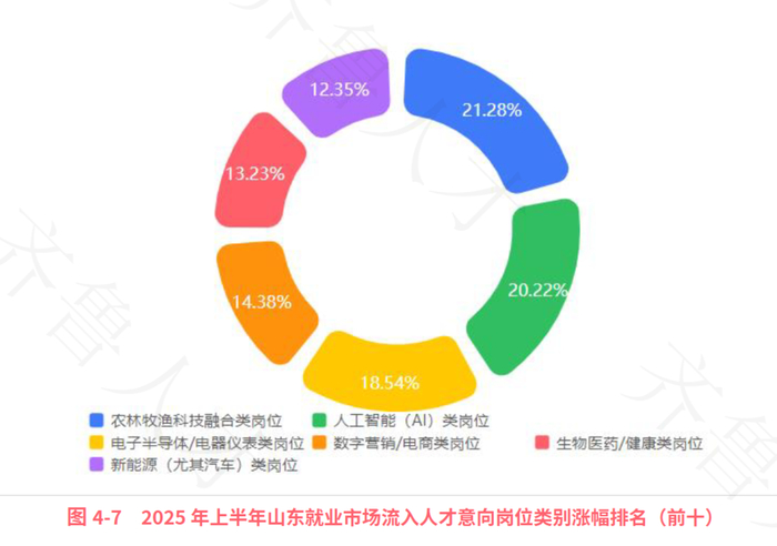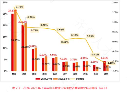 注:1.《2025年山东就业市场人才发展半年报告》数据来源基于齐鲁人才平台24.16万活跃求职者数据(2025年1月-6月);企业样本涵盖10.55万家活跃企业及其发布的33.15万条职位信息,并结合问卷调查。