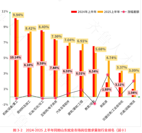 从岗位需求量(下图)看,机械/设备/重工行业以9.94%的人才需求量占比居首位,较2024年同期下降0.2%,但仍是吸纳就业的基本盘。