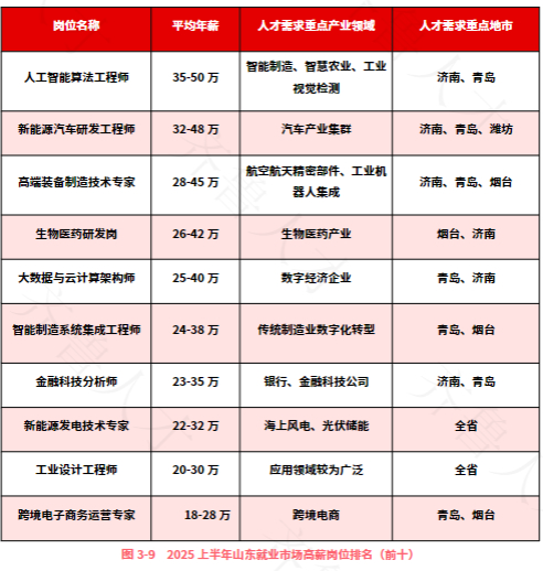《报告》显示,人工智能算法工程师以35-50万元年薪位居榜首,折射出济南、青岛两市在智能制造、智慧农业等领域的产业优势。新能源汽车研发工程师(32-48万)和高端装备制造技术专家(28-45万)紧随其后,凸显山东汽车产业集群与航空航天、工业机器人等高端制造领域的深度融合。