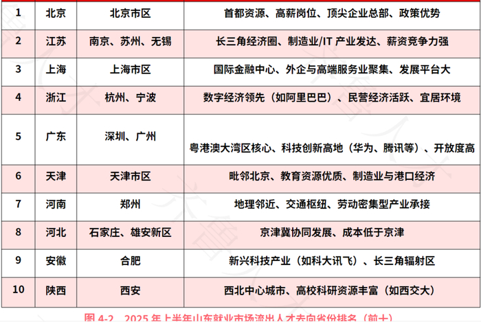在山东人才流出上,《报告》显示,2025年上半年山东就业市场流出人才去向前十省份,京津冀、长三角、珠三角三大核心城市群城市包揽前五(北京、苏沪浙、粤),总占比超60%。这三大经济圈聚集了金融科技(北京)、数字经济(浙江)、高端制造(江苏)、电子信息(广东)等前沿领域,能够提供高附加值岗位。