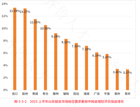 随着山东县域新兴产业的发展,对人才吸纳能力逐渐加强。《报告》根据2024年中新社发布的中国县域经济百强县排名,对入选的12个山东百强县上半年的岗位需求量进行分析。可以看出,县域经济对人才的吸纳能力差异显著,龙口、胶州、荣成位列前三,合计占比达38.21%,凸显沿海地区在县域经济中的核心地位。