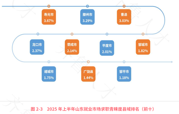 从县域就业市场对人才的吸引力来看,2025年上半年山东就业市场求职青睐度县域排名显示,寿光、滕州、曹县位居第一梯队,三地占比总计近10%,反映出这三个特色产业非常突出的县域在吸纳就业方面的突出能力。