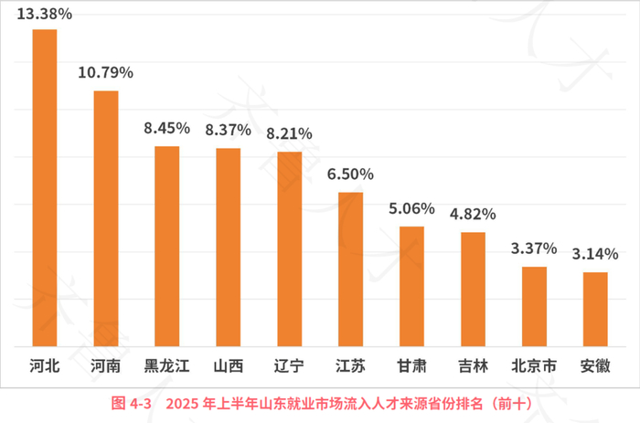 从流入山东的人才来看,体现了山东对环渤海经济圈和黄河流域人才的吸纳能力。《报告》显示,2025年上半年山东就业市场人才流入呈现显著的区域集聚特征,前十来源省份占比达72.09%,河北、河南、山西等邻近省份构成山东就业市场人才流入核心来源,这得益于地理邻近带来的低迁移成本和产业协同效应。东北地区人口外流趋势仍在延续,东北三省流入山东的人才合计占比21.48%,持续。