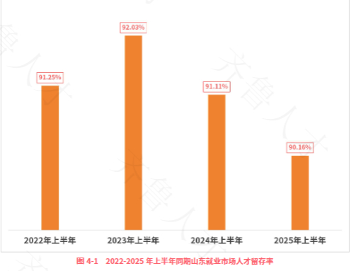 在人才留存率(下图)上,《报告》分析显示,山东在近四年人才留存方面表现稳定,始终保持在90%以上高位,特别是“抢人大战”白热化背景下,山东能够实现90%以上高留存率,充分说明了山东就业市场的强大韧性。