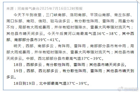 7月16日10时,中央气象台继续发布强对流天气蓝色预警。7月16日14时~17日14时,江淮、江汉等地部分地区有8级以上雷暴大风或冰雹天气,河南东南部等地部分地区风力可达11级以上;上述多地还伴有短时强降水,河南南部等地部分地区小时雨量超50毫米。未来三天,内蒙古中东部、东北等地多雷阵雨,江南南部等地有分散性强降水。未来三天河南天气预报: