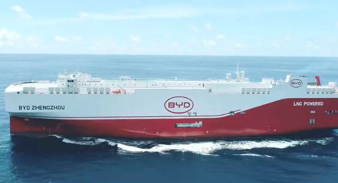 7月16日上午,比亚迪第七艘滚装船“郑州号”在广州命名交付。据了解,该船是由中船集团广船国际建造的7000车LNG双燃料汽车运输船,总长199.9米,型宽38米,设计吃水9米,设计航速18.5节,采用LNG双燃料推进系统,配备了永磁轴带发电机,同时采用节能装置、减阻防污漆等各类节能措施。