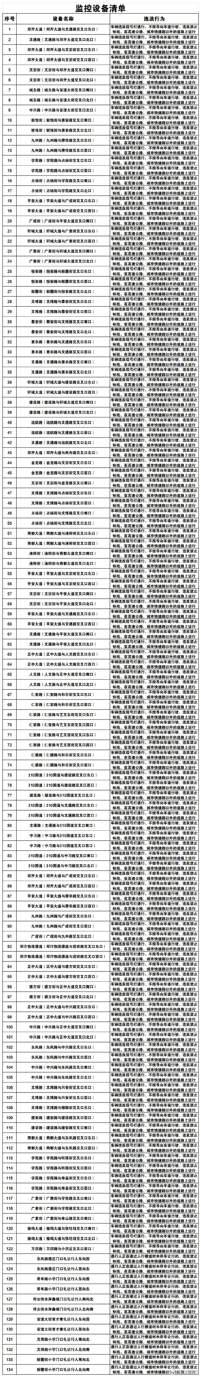 中牟新区公安局交通管理警察大队为推动交通管理工作,预防和减少交通事故,根据相关法律法规,在部分道路、路口整改、增设了一批交通技术监控设备。设备于2025年7月16日~22日公示,7月23日起正式抓拍。抓拍内容包括机动车闯红灯、不按导向车道行驶、逆向行驶、违反禁止标线指示以及未礼让行人等违法行为。