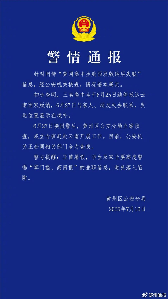 7月16日,湖北警方通报“3名高中生赴西双版纳后失联20余天”:情况基本属实,已立案侦查,成立专班赶赴云南开展工作。