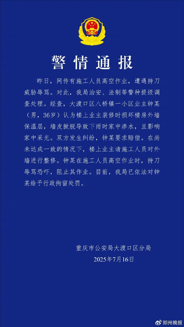7月16日,重庆警方通报“施工人员高空作业时遭楼下业主持刀威胁辱骂”:楼上楼下业主因装修发生纠纷,钟某(男,36岁)被行拘。