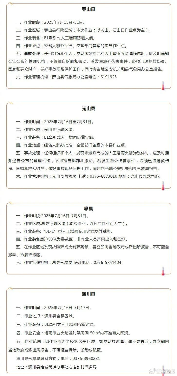 7月15日,信阳罗山县、光山县、息县、潢川县气象局发布人工增雨作业通知↓