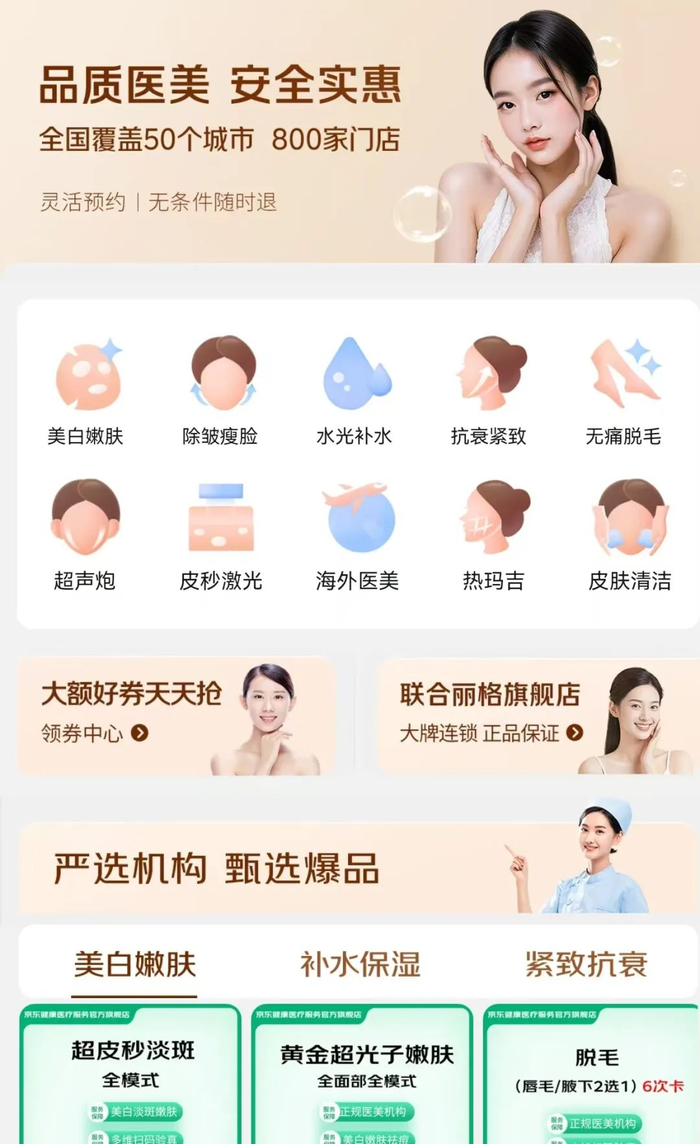 线下落地(2025年):通过战略投资悦美医疗、开设自营诊所,完成从流量入口到服务实体的转型。据悉,悦美医疗在全国拥有28家直营机构,年服务人次超50万,京东计划通过资本运作帮助其升级数字化系统。