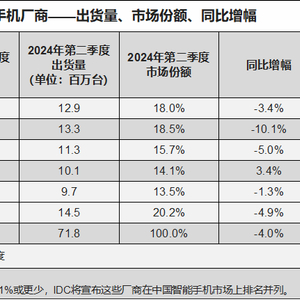 市场调研机构IDC的报告显示,二季度中国智能手机市场整体出货量同比下降 4.0%,降至6900万部,主要由于消费者需求减弱以及政府补贴推动的增长势头有所放缓。