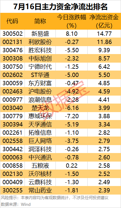 光模块龙头新易盛主力资金净流出居首,达14.77亿元;该股收盘上涨8.1%,成交额196.64亿元,居A股首位。热门股利欧股份主力资金净流出11.86亿元,居次席,净流出额创2025年3月10日以来新高。