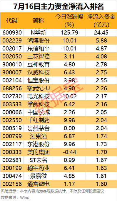 年内最大IPO今日登陆A股。新股N华新主力资金净流入24.45亿元,居首。该股上市首日大涨,盘中一度涨近220%,两度触发临停,收盘涨幅达125.79%,成交额为127.02亿元,总市值超2900亿元。