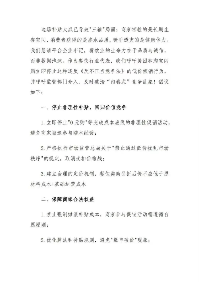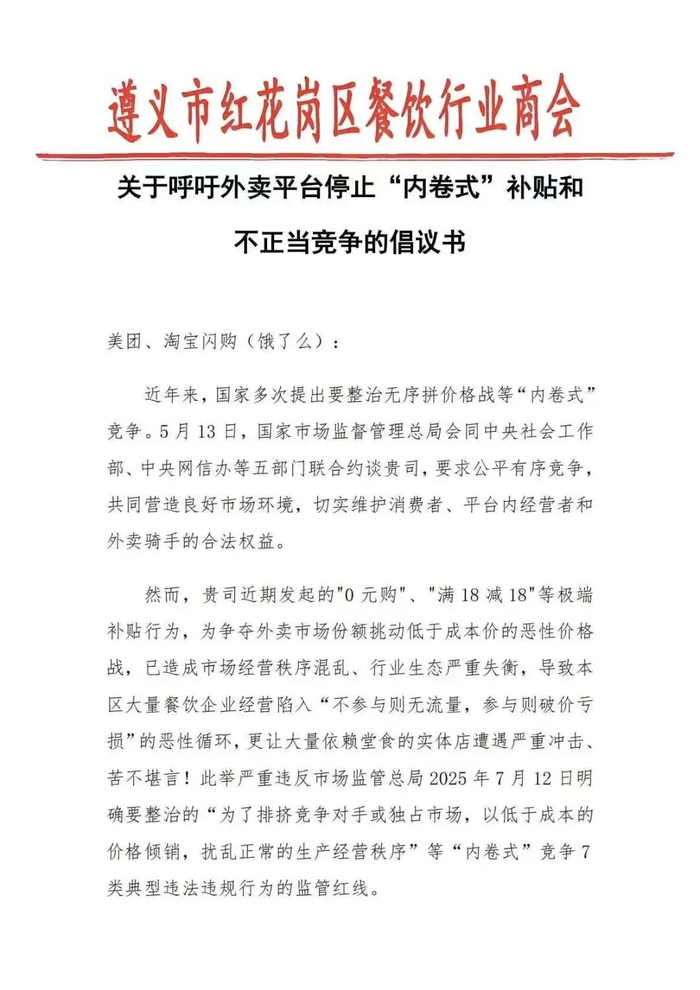 值得注意的是,7月15日,遵义市红花岗区餐饮行业商会发布《关于呼吁外卖平台停止“内卷式”补贴和不正当竞争的倡议书》。该倡议书,直指平台极端补贴行为挑起恶性价格战的后果,并提出了三点倡议。