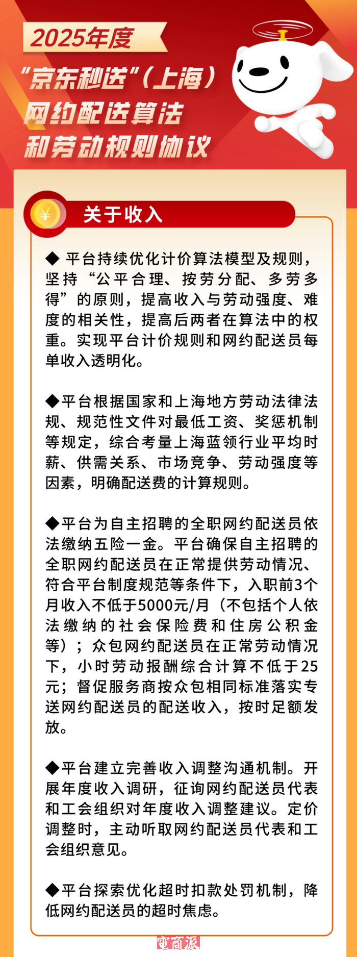 此外,京东秒送还签订了《2025年度“京东秒送”(上海)网约配送算法和劳动规则协议》,内容围绕着骑手收入、休息权益、劳动保护、协商协调机制等多方面展开,给足骑手福利。