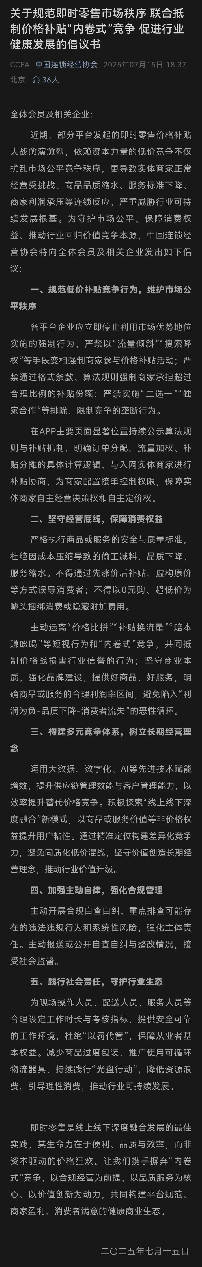 同时,中国连锁经营协会也发布了《关于规范即时零售市场秩序 联合抵制价格补贴“内卷式”竞争 促进行业健康发展的倡议书》。同样指出外卖大战所带来的问题,期望行业能回价值竞争本源。
