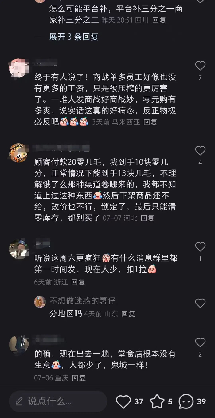 此外,有商家吐槽外卖大战,看似爆单,但实际上累死累活一天利润仅400元。不少商家陷入了“不参与则无流量,参与则破价亏损”的恶性循环。明明比以前更忙,但赚的可能没以前多,有种白忙活的感觉。