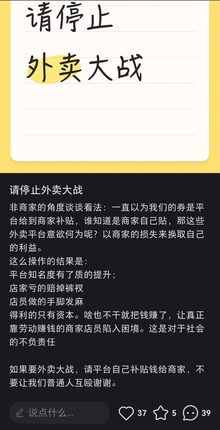 我们不是不支持外卖大战,我们需要的是有序、公平、健康、合理的竞争。后续,希望平台能调整相关的发展策略,让竞争回归价值本源。