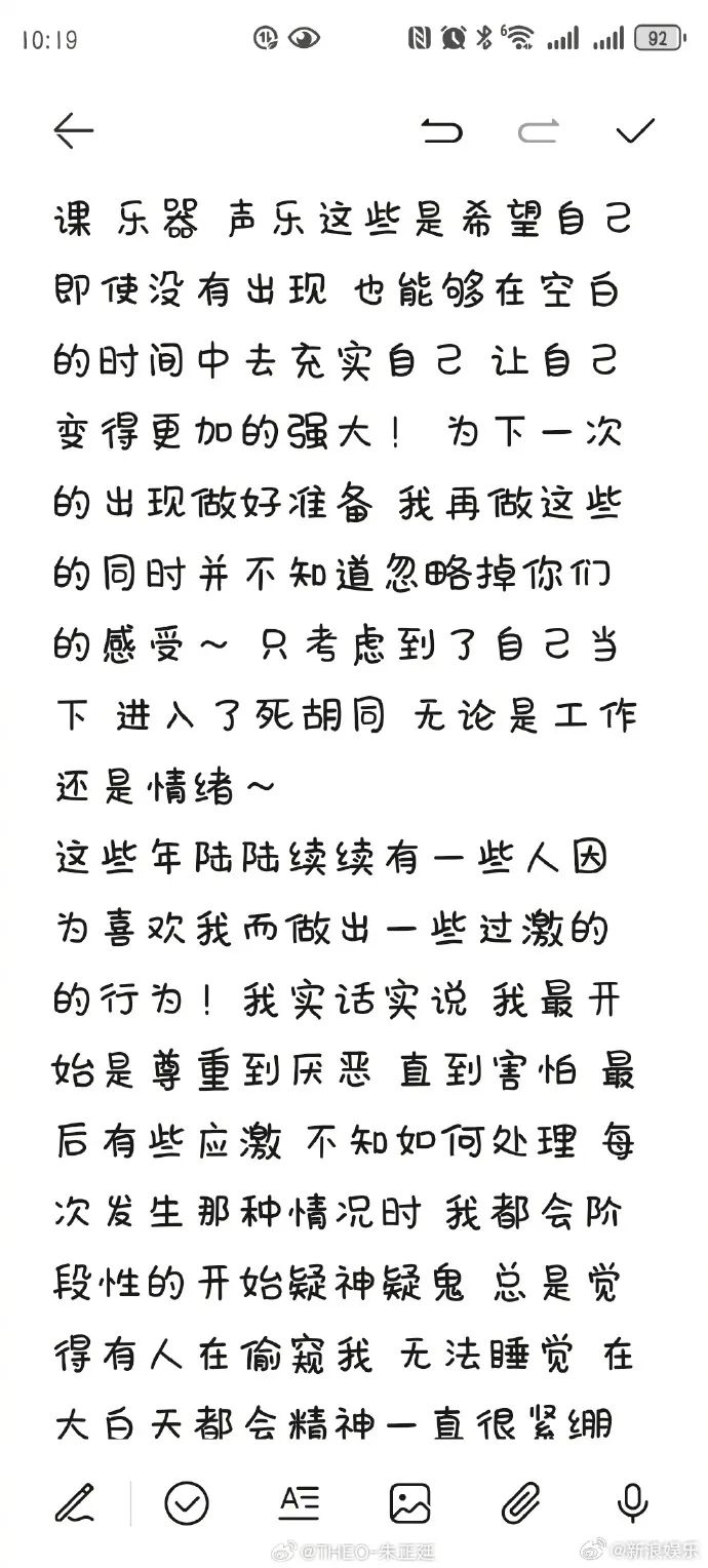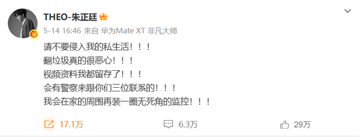 5月15日,知名男星@THEO-朱正廷连续发文,怒斥“私生饭”,并表示他已为此报警,之后会在家再装一圈无死角监控。