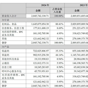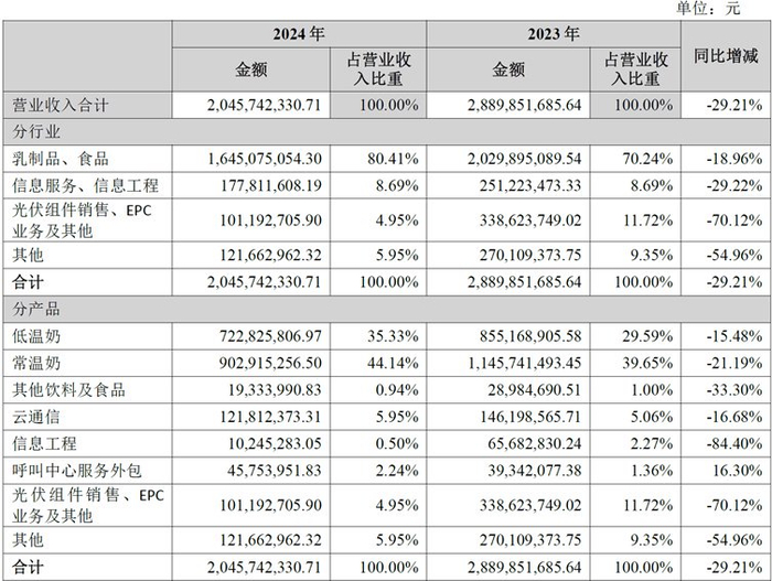 2024年,公司营收规模20.46亿元,同比下降了29.21%。其中,乳制品和食品业务收入16.45亿元,同比下降18.96%;信息服务和信息工程业务收入1.78亿元,同比下降29.22%;光伏组件销售、EPC业务及其他收入为1.01亿元,同比下降70.12%。能够看得出来,2024年公司的各项业务正在遭受全面溃败,下滑趋势显著。遥想当年,公司也发出过要在2028年实现“百亿乳企”的豪言壮语,如今已是有心无力。