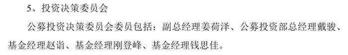 2025年6月的招募说明书显示,泉果基金的公募投资决策委员会委员包括副总经理姜荷泽、公募投资部总经理戴骏、基金经理赵诣、基金经理刚登峰、基金经理钱思佳。