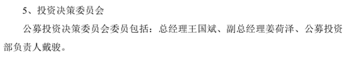泉果基金成立后,戴骏就在公司投研体系中占据很重要的一席。以2022年泉果基金首只基金产品泉果旭源基金的首份招募说明书来看,当时公募投资决策委员会委员就包括总经理王国斌、副总经理姜荷泽、公募投资部负责人戴骏。