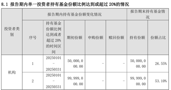 一直到最新的2025年1季报信息也显示,仍然该基金为机构主导。2个机构户头是该基金最重要的持有者,合计持有基金份额近8成的基金份额。