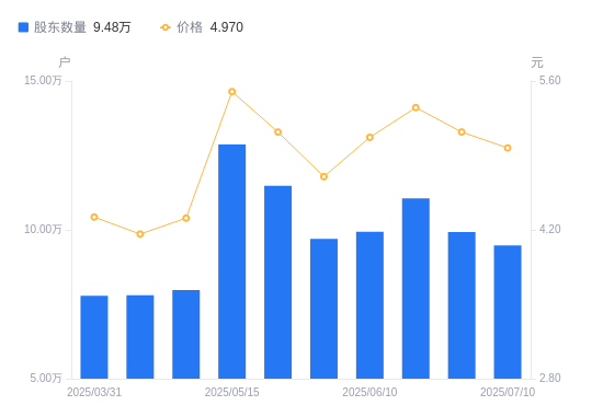 近一年(2024年7月10日至2025年7月10日),凤凰航运A股股东户数从8.83万户,增加至9.48万户,增幅7.33%,区间股价上涨111.49%。