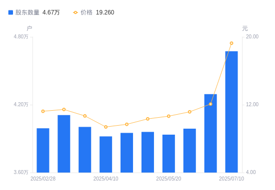 近一年(2024年7月31日至2025年7月10日),铜冠铜箔A股股东户数从4.89万户,减低至4.67万户,降幅4.43%,区间股价上涨92.60%。