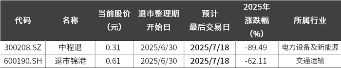 目前,有2只个股正处于退市整理期,分别是中程退、退市锦港。