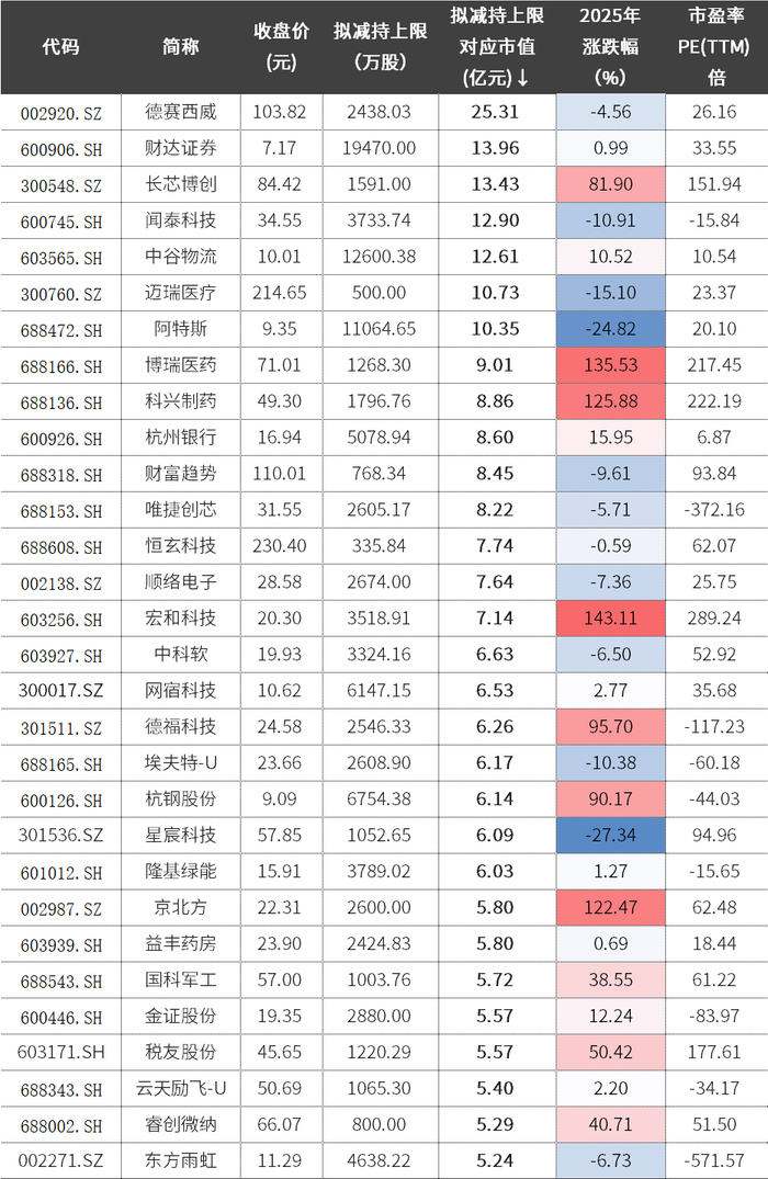 具体到个股,按最新收盘价计算,德赛西威、财达证券、长芯博创等7股的拟减持上限规模超10亿元,另有25股超5亿元,而减持拟减持上限规模超1亿元的公司则有近250家。