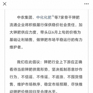 会议倡议,钾肥行业上下游应正确看待当前钾肥供需形势,坚决抵制恶意炒作行为,不信谣、不传谣,不追涨、不囤货惜售,维护市场秩序,稳定市场预期,尽快推动钾肥价格回归至合理水平。