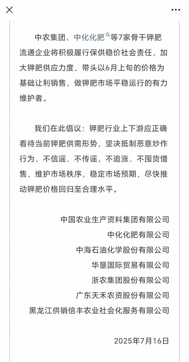 此次联合倡议的7家公司为中国农业生产资料集团有限公司、中化化肥有限公司、中国化工建设有限公司、华垦国际贸易有限公司、浙农集团股份有限公司、广东天禾农资股份有限公司、黑龙江供销倍丰农业社会化服务有限公司,七大公司联合倡议。