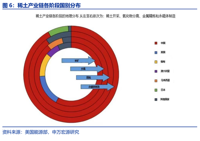 我国在稀土领域具备从采选到应用的完备产业链,其他国家难以建立替代供应链。稀土产业链大致分为上游的稀土矿采选,中游的氧化物分离、金属冶炼及功能材料制备,下游则涵盖永磁体制造等环节。从全球布局来看,只有中国实现了从资源到应用的全链条覆盖。相比之下,其他国家普遍缺乏中游技术和产能支撑,难以独立构建完整供应链。