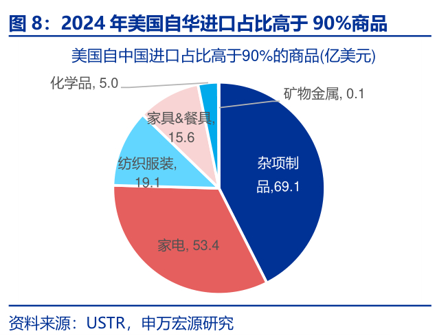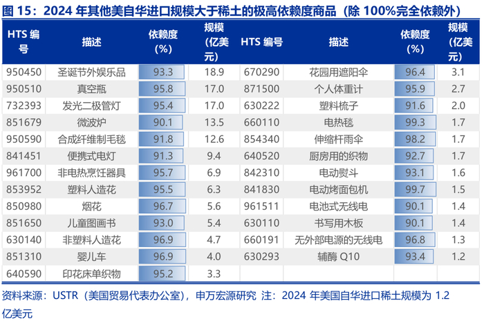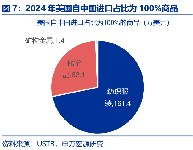 以美国为例,海外在化学品、矿物金属、杂项品、家电、纺织服装等领域均对中国有“极高依赖”和“完全依赖”的商品。以美国海关的HTS6位商品编码为依据,2024年美国自华进口占比大于90%(“极高依赖”)的共有98种商品,占美自华总进口的3.5%,规模为162.5亿美元。为了更好地进行分析,我们将98种商品归为杂项制品、家电、纺织服装、家具&餐具、化学品,和矿物金属六大类。其中有20个商品的自华进口占比达到了100%(“完全依赖”),规模为224.9万美元,主要集中在纺织服装、化学品和矿物金属。