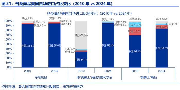 从美国自华进口占比的变化来看,近20年化学品的进口比例大幅提升,显示其在美国供应中的重要性显著增强。数据上看,美国自华进口的化学品从2010年的34.1%大幅提升61.4pct至2024年的95.4%,总进口规模为5.0亿美元。这一提升幅度以及进口占比都远高于其他商品,显示我国化学品在美国供应链中的重要性显著增强。其余商品来看,“类稀土”品、家电、纺服、杂项品的美自华进口比例较2010年分别上升了14.3pct、12.2pct、2.5pct和1.7pct至83.8%、93.5%、92.6%和95.0%。然而,家具及餐具的美自华进口占比相较于2010年则是小幅下滑了0.5pct至95.2%。